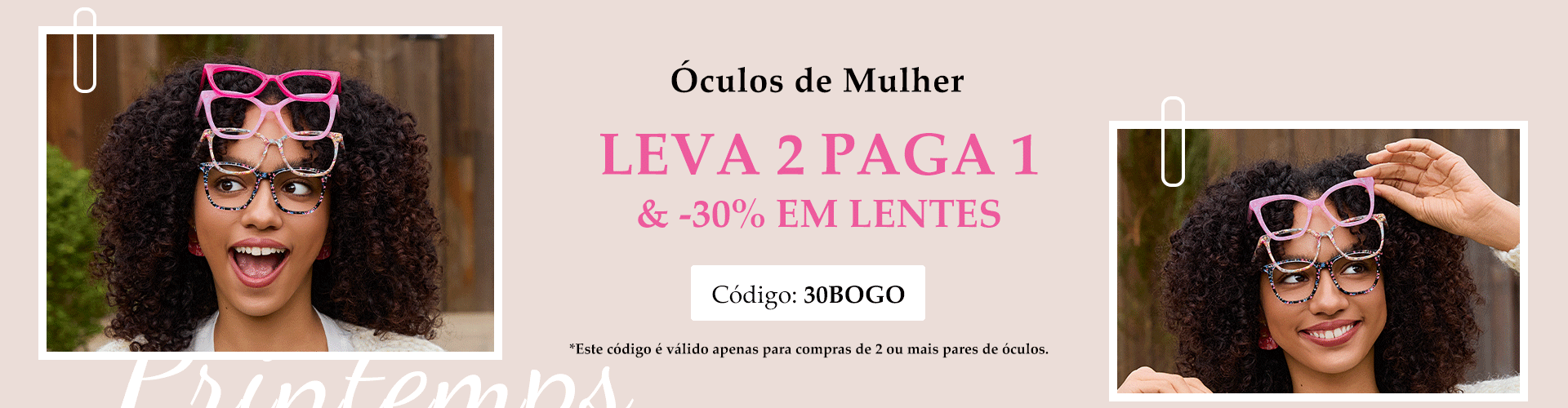 Leva 2 Paga 1 & -30% nas lentes! Código: 30BOGO